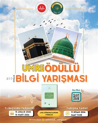 Gençlerin sahih dinî bilgi ve manevi değerlerle donanacağı Umre Ödüllü Gençlik Bilgi Yarışması başvuruları 15 Aralık’ta başladı. Kaybedeni olmayan bu anlamlı yarışmaya tüm liseli ve üniversiteli gençlerimizi davet ediyoruz.